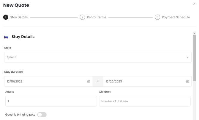 A pop-up window will appear. In this first section, you can select the unit, the stay duration, and the number of guests.
