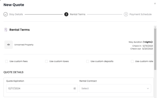 In the 2nd step, set the quote expiration. Think of it like a limited-time offer; we recommend a best practice of 24 hours for real bookings. Don't forget to choose the Rental Contract here.