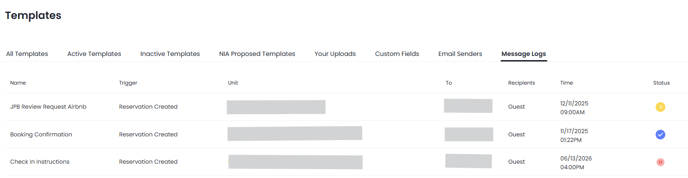 The Message Logs section shows you a detailed view of every message template scheduled to send, already sent, or paused for your reservations.