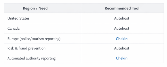 Jurny supports two screening tools. Autohost focuses on guest risk screening and security for North America, while Chekin focuses on automated guest registration and reporting to authorities, primarily in Europe.